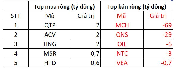 Ngược chiều, cổ phiếu MCH bị bán ròng đột biến 69 tỷ đồng, QNS bị xả mạnh 29 tỷ, OIL và NTC cũng bị bán ròng vài tỷ đồng trên sàn UPCOM.