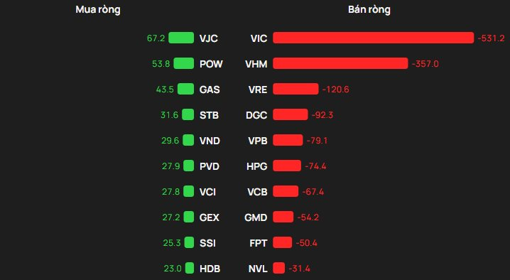 Ở chiều ngược lại, dòng tiền ngoại đổ vào thị trường có phần khiêm tốn hơn. VJC là cổ phiếu được mua ròng mạnh nhất nhưng giá trị chỉ dừng lại ở mức 67 tỷ đồng. Các mã tiếp theo trong top 5 mua ròng lần lượt là POW (54 tỷ đồng), GAS (44 tỷ đồng), STB (32 tỷ đồng) và VND (30 tỷ đồng).