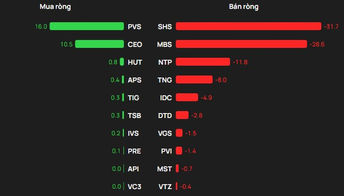 Ngược lại, PVS dẫn đầu danh sách mua ròng, mã này được gom với 16 tỷ đồng, theo sau là CEO với giá trị mua ròng đạt 11 tỷ đồng. Các mã còn lại như HUT, APS hay TIG ghi nhận lực mua ròng không đáng kể, dưới 1 tỷ đồng mỗi mã.