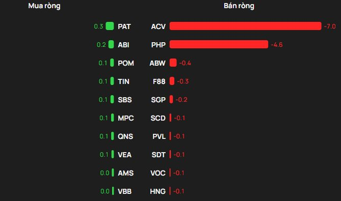 Tại chiều mua, lực mua ròng trên sàn này diễn ra hết sức nhỏ giọt. PAT là cổ phiếu dẫn đầu danh sách mua ròng nhưng giá trị chỉ đạt vỏn vẹn 0,3 tỷ đồng. Tiếp sau đó là các mã ABI (0,2 tỷ đồng), POM, TIN và SBS với cùng mức mua ròng nhẹ chỉ 0,1 tỷ đồng.