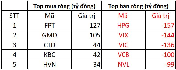 Ngược chiều, FPT được mua ròng mạnh nhất toàn thị trường với giá trị 127 tỷ đồng, GMD cũng được rót ròng hơn 100 tỷ đồng. Ngoài ra, CTD, KBC và HVN cũng được mua ròng với giá trị dao động từ 34 tỷ tới 44 tỷ đồng mỗi cổ phiếu.