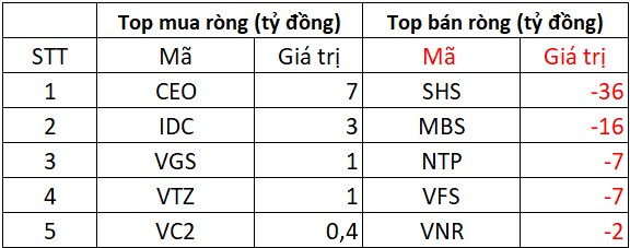 Tại chiều mua, các cổ phiếu trên sàn HNX được mua ròng vài tỷ đồng gồm có CEO (7 tỷ); IDC (3 tỷ). Ngoài ra, VGS và VTZ cũng được "gom hàng" khoảng 1 tỷ đồng.