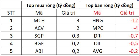 Chiều mua, cổ phiếu MCH và ACV được mua ròng với giá trị 2-3 tỷ đồng; theo sau, SGP, BGE và ABI cũng được mua ròng khoảng vài trăm triệu đồng mỗi mã.