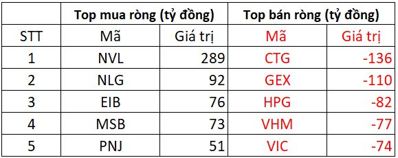 Ngược chiều, NVL được mua ròng mạnh nhất toàn thị trường với giá trị 289 tỷ đồng, NLG cũng được rót ròng khoảng 92 tỷ đồng. Ngoài ra, EIB, MSN và PNJ cũng được mua ròng với giá trị dao động từ 51tỷ tới 76 tỷ đồng mỗi cổ phiếu.
