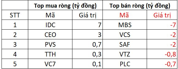 Tại chiều mua, cổ phiếu IDC được khối ngoại mua mạnh với giá trị 7 tỷ đồng, CEO cũng được mua ròng 3 tỷ. Ngoài ra, PVS, TTH và VC7 cũng nằm top mua ròng trong phiên hôm nay.