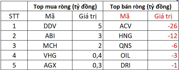 Ngược chiều, cổ phiếu ACV, HNG và QNS lần lượt bị bán ròng 26 tỷ, 12 tỷ và 6 tỷ đồng. OIL bị bán ròng 3 tỷ đồng, DRI cũng bị bán ròng không đáng kể