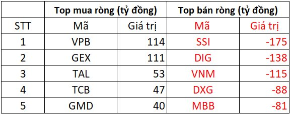 Chiều mua, VPB và GEX được mua ròng mạnh nhất toàn thị trường với giá trị lần lượt 114 tỷ và 111 tỷ. Theo sau, các cổ phiếu TAL, TCB và GMD được "gom" ròng với giá trị dao động từ 40 tỷ tới 53 tỷ đồng.