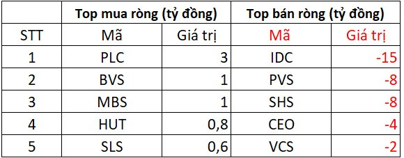 Tại chiều mua, cổ phiếu PLC được rót ròng 3 tỷ; theo sau, cổ phiếu BVS, MBS, HUT và SLS được rót ròng khoảng vài trăm triệu tới 1 tỷ đồng.