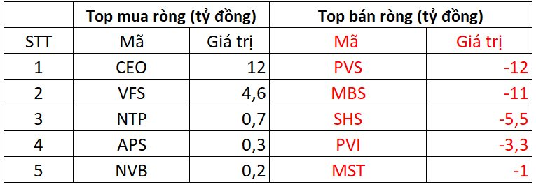 Tại chiều mua, CEO được mua ròng mạnh nhất với giá trị 12 tỷ đồng. Bên cạnh đó, VFS xếp tiếp theo trong sách mua ròng mạnh trên HNX với 4,6 tỷ đồng. Ngoài ra, khối ngoại cũng chi vài tỷ đồng để gom ròng NTP, APS, NVB.