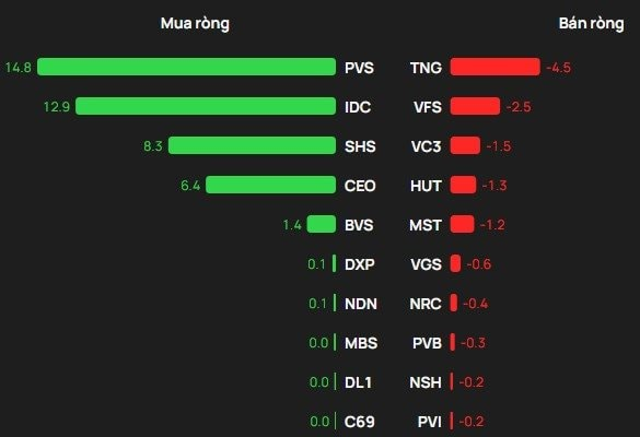 Chiều ngược lại, TNG là mã chịu áp lực bán ròng của khối ngoại với giá trị gần 4,5 tỷ đồng; theo sau VFS bị bán 2,5 tỷ, VC3, HUT, MST bị bán từ vài tỷ đồng.