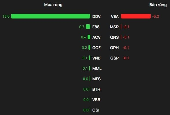 Chiều mua, cổ phiếu DDV được khối ngoại mua 14 tỷ đồng. Theo sau, F88 và acv cũng được mua ròng mỗi mã vài trăm triệu đồng.