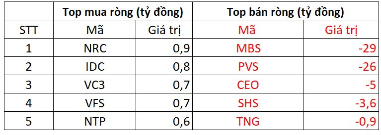 Chiều ngược lại, MBS là mã chịu áp lực bán ròng của khối ngoại với giá trị gần 29 tỷ đồng; theo sau PVS bị bán 26 tỷ, CEO, SHS, TNG bị bán từ vài tỷ đồng.