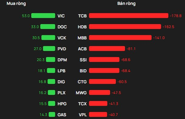 Tại chiều mua, cổ phiếu VIC được khối ngoại mua mạnh nhất trên HOSE với giá trị hơn 53 tỷ đồng. Theo sau, DGC và VCK là mã tiếp theo được gom mạnh 33 tỷ đồng và 31 tỷ đồng.