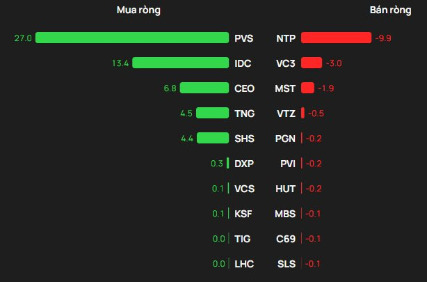 Tại chiều mua, PVS được mua ròng mạnh nhất với giá trị 27 tỷ đồng. Bên cạnh đó, IDC xếp tiếp theo trong sách mua ròng mạnh trên HNX với 13 tỷ đồng. Ngoài ra, khối ngoại cũng chi vài tỷ đồng để gom ròng SHS, CEO, TNG.