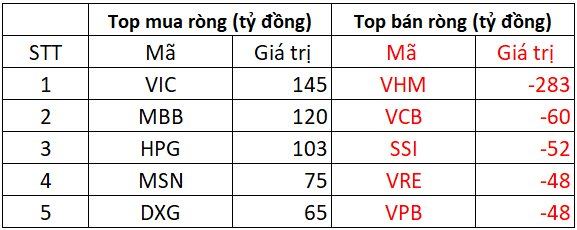 Chiều mua, cổ phiếu VIC được mua ròng mạnh nhất toàn thị trường với giá trị 145 tỷ đồng, cổ phiếu MBB và HPG cũng được mua ròng với giá trị hơn trăm tỷ đồng mỗi mã. Xếp tiếp theo, cổ phiếu MSN và DXG đồng loạt được mua ròng khoảng 65-75 tỷ đồng.