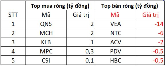 Chiều mua, cổ phiếu QNS và MCH được mua ròng với giá trị khoảng 2 tỷ đồng; theo sau, KLB, MPC và CSO cũng được mua ròng nhẹ.