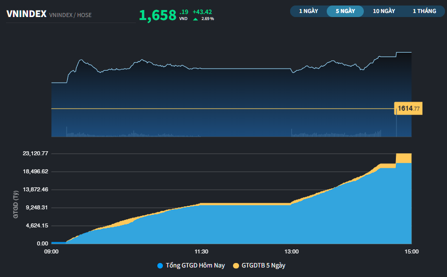 Phiên hồi phục thứ 2 của thị trường ghi nhận độ rộng đạt 73% số mã tăng giá. Chỉ số VN-Index tăng 43,42 điểm lên 1.658,19 điểm (+2,69%). Tổng khối lượng giao dịch đạt 888,24 triệu đơn vị, tương đương 22.463 tỷ đồng.