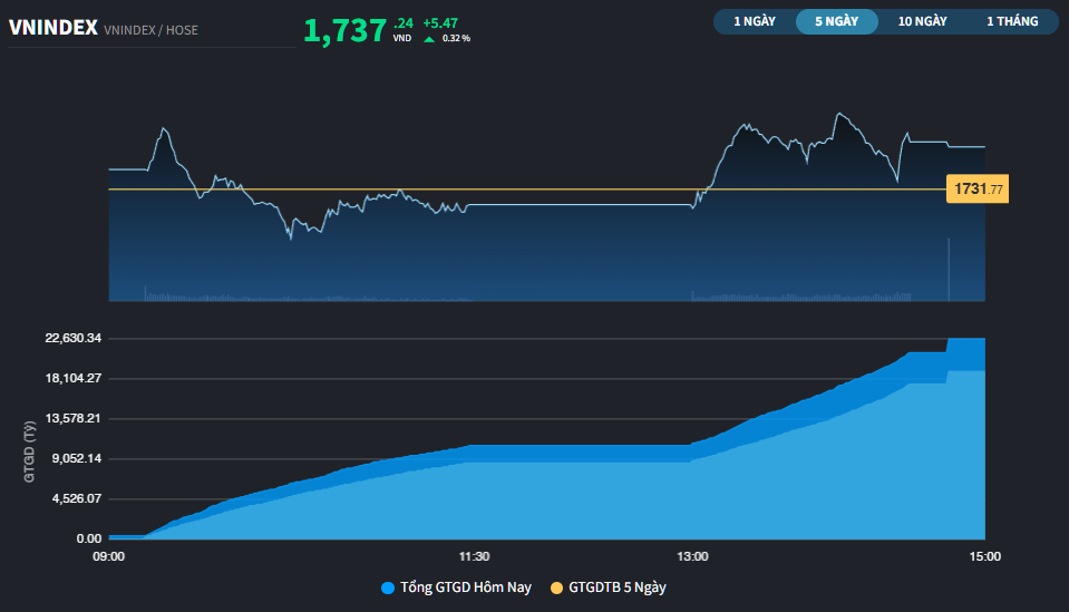 Dù có rung lắc, VN-Index vẫn ghi nhận phiên tăng điểm thứ 7 liên tiếp. Chỉ số tăng 5,47 điểm lên 1.737,24 điểm (+0,32%). Tổng khối lượng giao dịch sàn đạt 25.307 tỷ đồng.