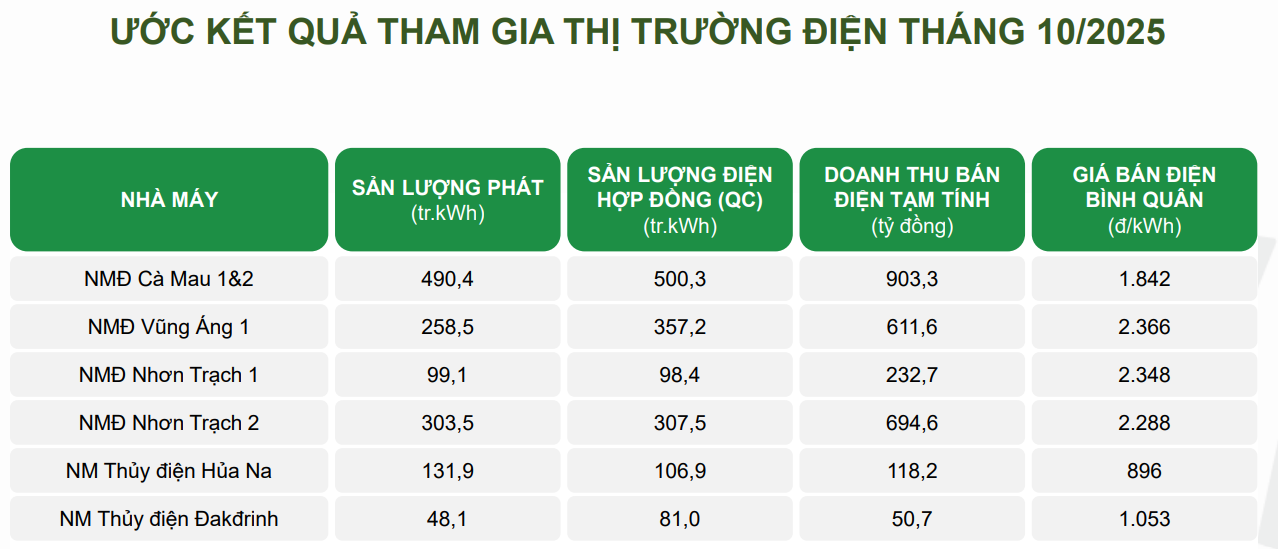 Riêng tháng 10, tổng sản lượng điện của các nhà máy điện PV Power ước đạt khoảng 1.451 triệu kWh, mang lại doanh thu bán điện tháng 10 khoảng 2.611 tỷ đồng, chủ yếu đến từ nhà máy điện Vũng Áng 1, tiếp đó là Nhơn Trạch 2 và Cà Mau 1&2.