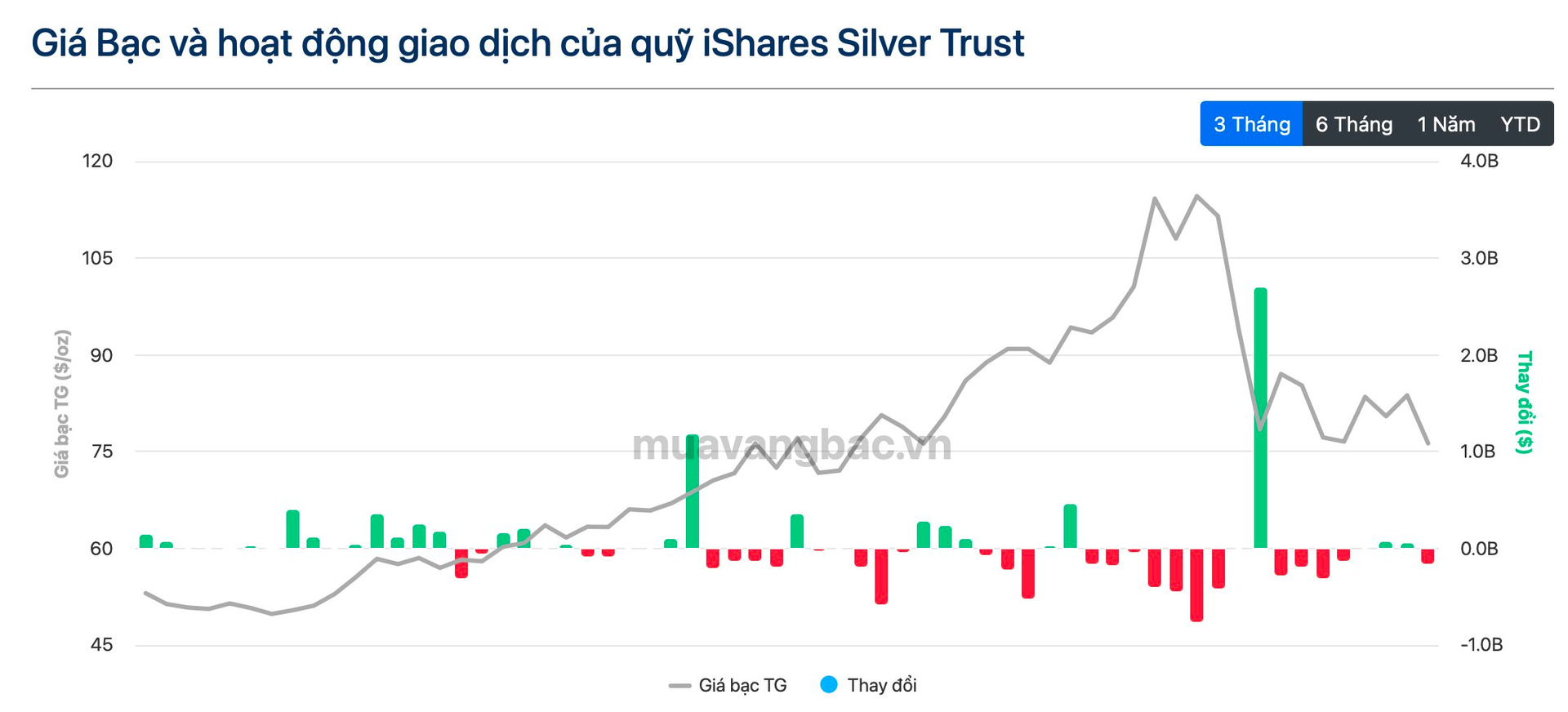 Theo dữ liệu từ muavangbac.vn, quỹ bạc iShare Silver Trust (SLV) đã quay xe bán ra trong phiên 12/2, với giá trị khoảng 170 triệu USD (tương 70 tấn bạc). Trước đó, quỹ đã mua vào 2 phiên liên tiếp. SLV hiện là quỹ bạc lớn nhất thế giới, nắm giữ hơn 16,6 nghìn tấn, quy mô tài sản khoảng 43,4 tỷ USD.