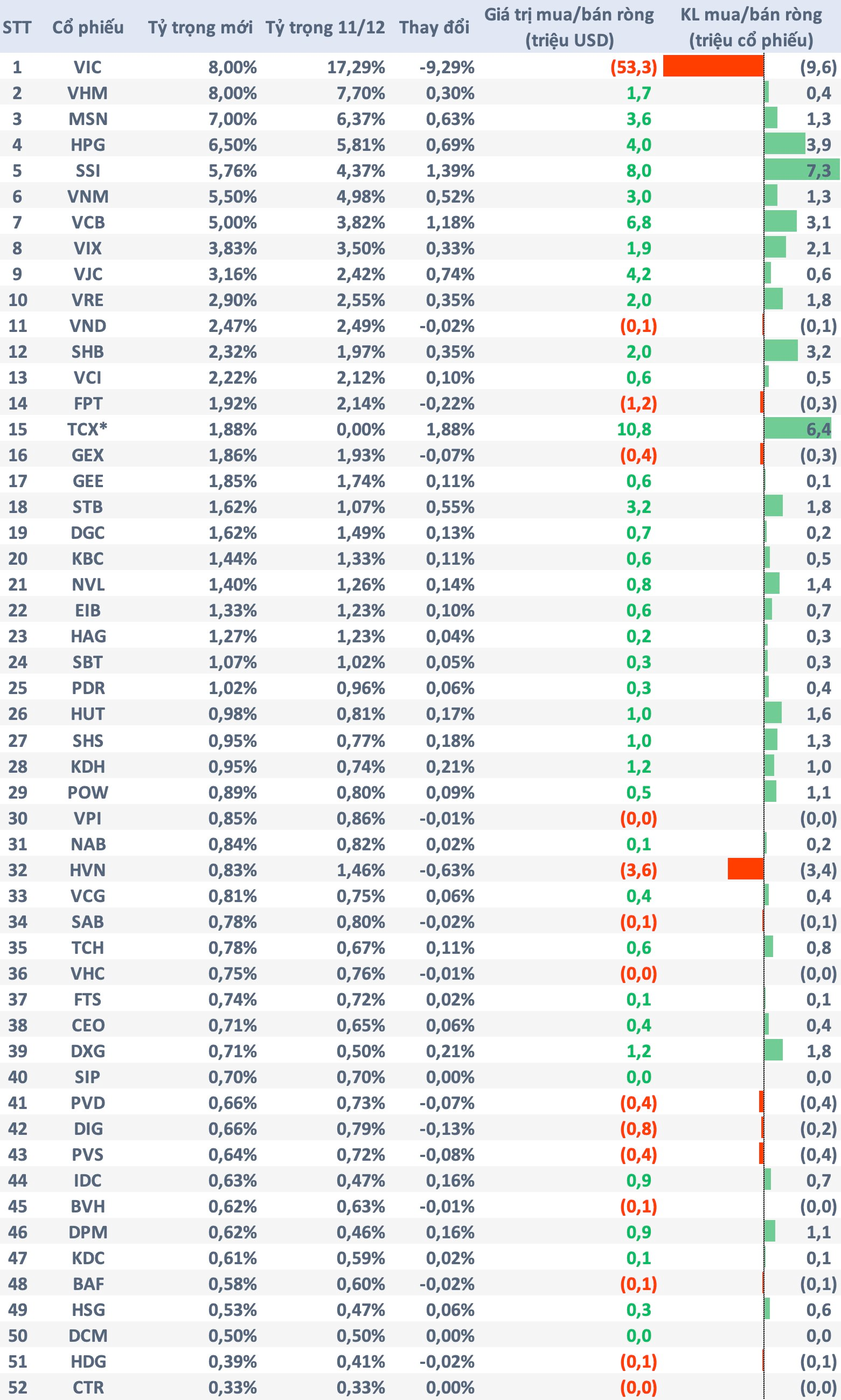 Chiều ngược lại, VNM ETF sẽ giảm tỷ trọng một số cổ phiếu trong danh mục. Ước tính, VIC sẽ bị bán mạnh nhất hơn 53 triệu USD (khoảng 9,6 triệu cp). HVN cũng dự kiến bị bán mạnh khoảng 3,4 triệu cp. Ngoài ra, các mã khác bị giảm tỷ trọng nhưng không lớn.