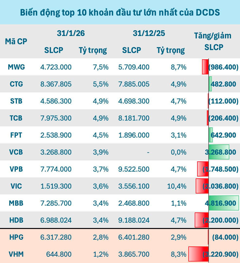 Trong tháng 1, DCDS đã bán ròng hơn 2 triệu cổ phiếu VIC và 3,2 triệu cổ phiếu VHM. VIC từ vị trí top 1 danh mục cuối năm 2025 với tỷ trọng 10,4% đã giảm xuống chỉ còn 3,6% vào cuối tháng 1 (xếp thứ 8). Trong khi đó, VHM không còn nằm trong top 10 khoản đầu tư lớn nhất của DCDS vào cuối tháng 1 khi tỷ trọng chỉ còn 1,2%.