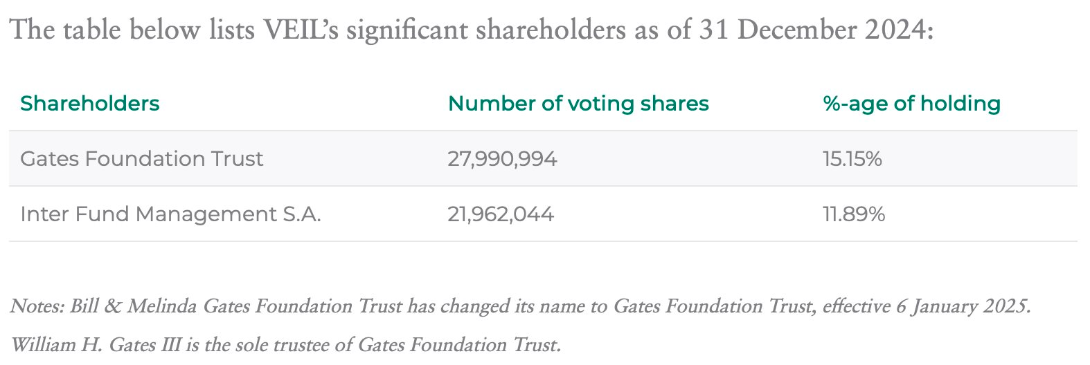 Theo cập nhật trên website, hai cổ đông lớn nhất của VEIL tính đến thời điểm 31/12/2024 là Gates Foundation Trust (15,15%) và Inter Fund Management S.A. (11,89%). Đây đều là những tổ chức “khổng lồ” với quy mô tài sản quản lý lên đến lên đến hàng chục tỷ USD.