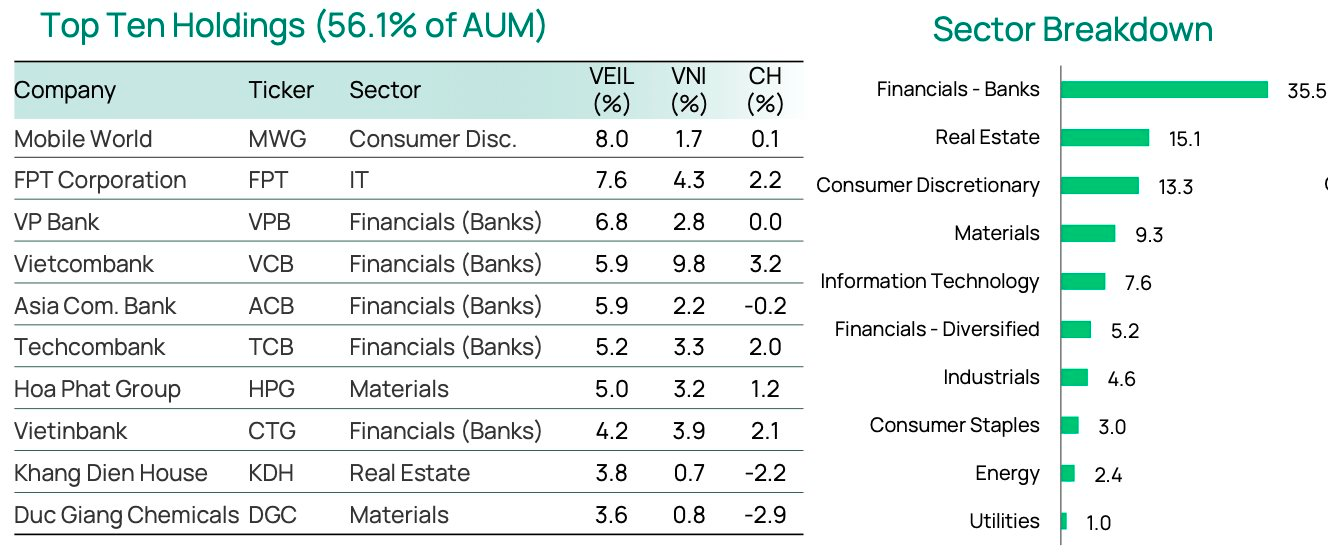 Danh mục đầu tư của VEIL tập trung vào các cổ phiếu ngân hàng, bất động sản, tiêu dùng, vật liệu và công nghệ thông tin. Tại ngày cuối tháng 1/2025, top 10 khoản đầu tư lớn nhất danh mục chiếm hơn 56% tài sản quản lý của quỹ. Trong đó, MWG chiếm tỷ trọng lớn nhất với 8%, theo sau lần lượt là FPT (7,6%), VPB (6,8%), VCB 95,9%),…