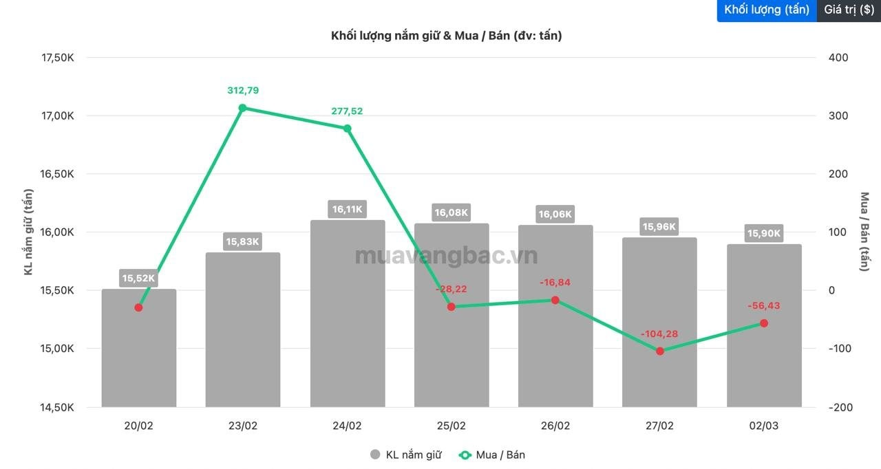 Theo dữ liệu từ muavangbac.vn, quỹ vàng lớn nhất thế giới SPDR Gold Trust đã ngừng mua trong ngày 2/3 sau chuỗi 5 phiên mua ròng liên tiếp, qua đó giữ nguyên lượng vàng nắm giữ ở mức trên 1.100 tấn.