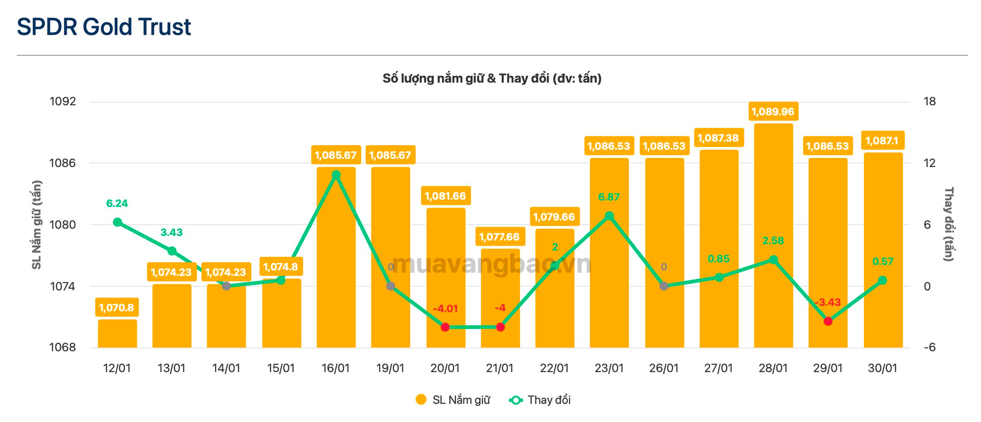 Theo cập nhật mới nhất từ muavangbac.vn, quỹ vàng lớn nhất thế giới SPDR Gold Shares đã mua vào 0,6 tấn vàng trong ngày 30/1, qua đó nâng tổng lượng nắm giữ lên 1.087 tấn. Đây là lượng vàng nắm giữ bởi quỹ cao nhất trong vòng 5 năm, kể từ đầu năm 2021. Nếu xét về giá trị, quy mô của quỹ đang ở mức kỷ lục khoảng 180 tỷ USD.