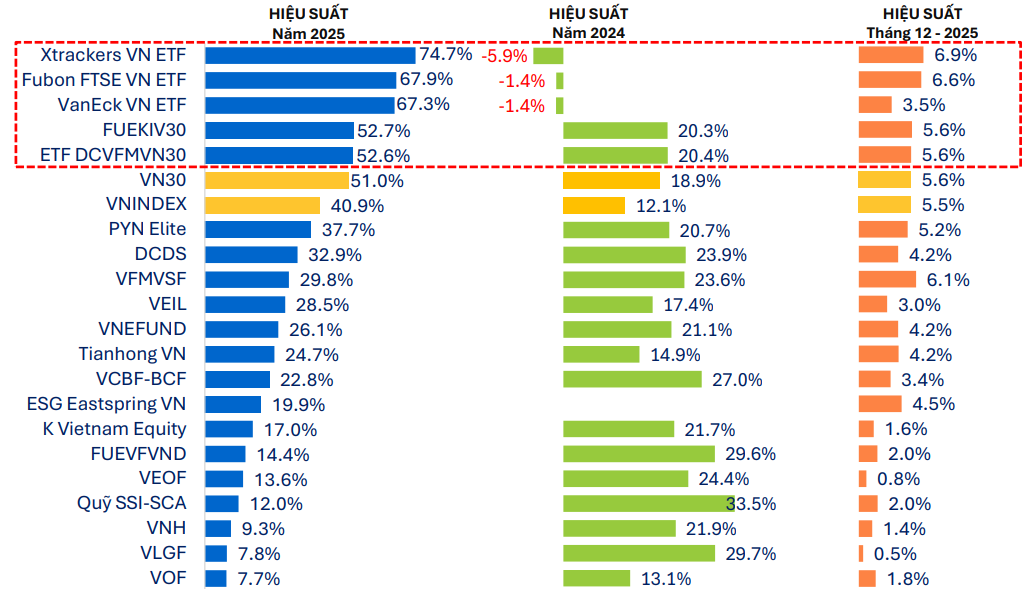 Trong tổng số 77 quỹ cổ phiếu được theo dõi, chỉ 10 quỹ có hiệu suất vượt VN-Index và 40 quỹ cải thiện hiệu suất so với năm 2024. Nhóm có kết quả nổi bật nhất là các quỹ ETF ngoại có quy mô lớn và ETF tham chiếu VN30, như Xtrackers Vietnam ETF đạt hiệu suất lên tới 74,7%, tiếp sau là Fubon FTSE Vietnam ETF với 67,9% hay VanEck VN ETF với hiệu suất 67,3%...