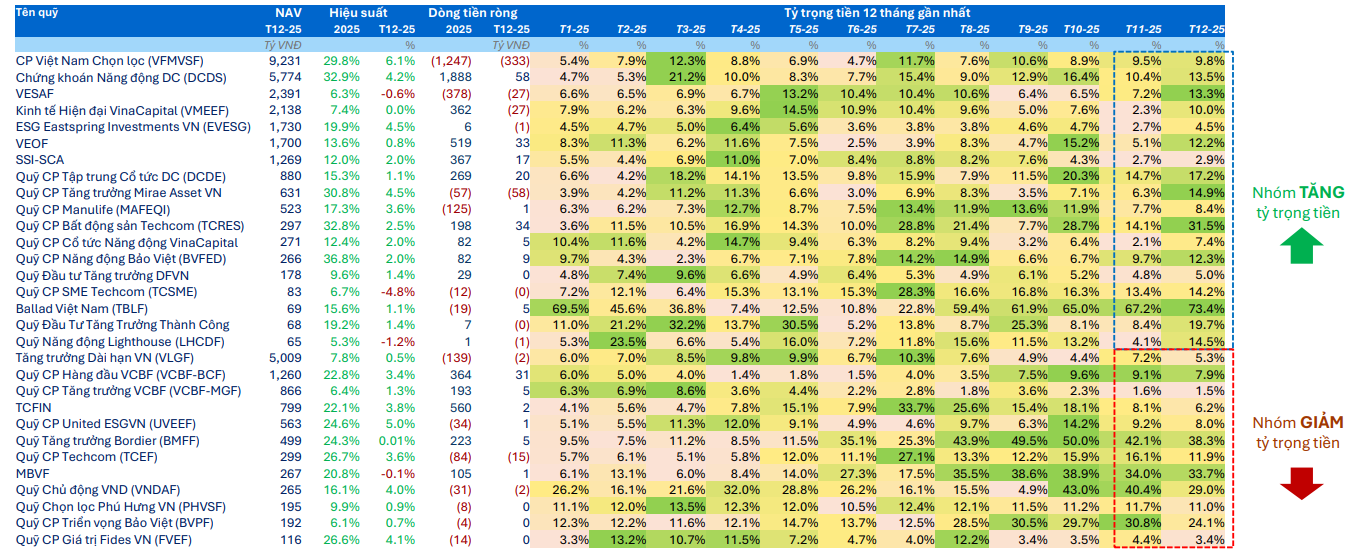 Bên cạnh xu hướng rút ròng, báo cáo của FiinGroup cũng ghi nhận nhiều quỹ mở cổ phiếu tăng tỷ trọng tiền mặt trong tháng cuối năm (21/36 quỹ). Phần lớn các quỹ có quy mô NAV trên 1.000 tỷ đồng đều có động thái giảm giải ngân, cho thấy tâm lý thận trọng hơn của các nhà quản lý quỹ khi chỉ số VN-Index tiến gần đến ngưỡng 1.800.