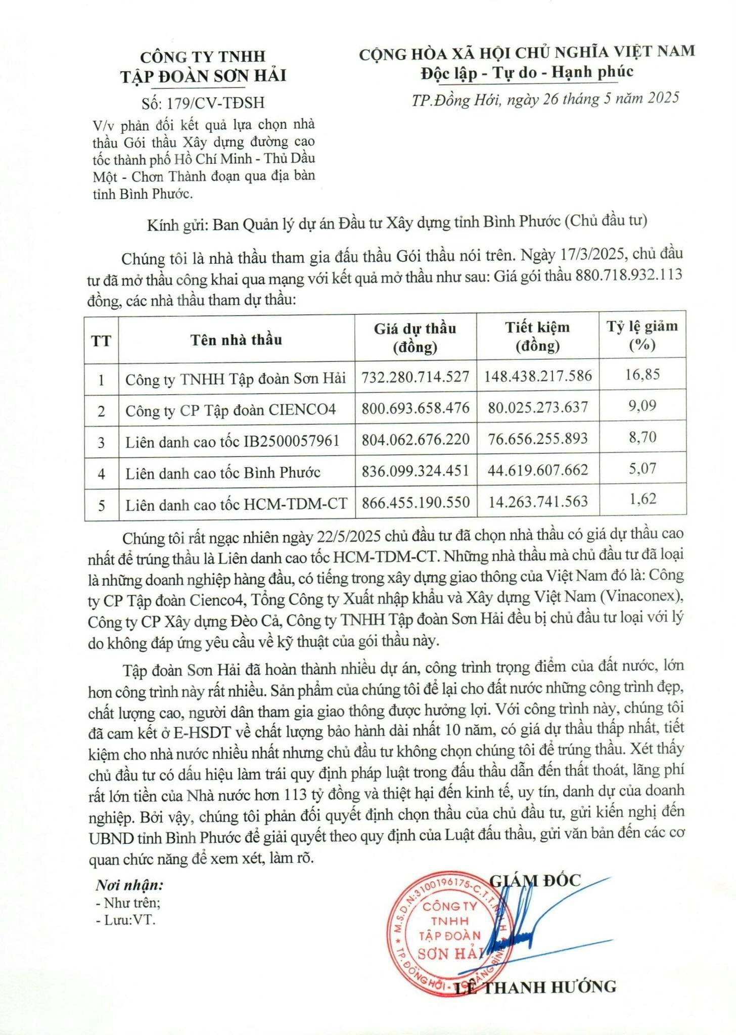 Ngày 26/5, Công ty TNHH Tập đoàn Sơn Hải vừa gửi công văn tới Ban Quản lý dự án Đầu tư Xây dựng tỉnh Bình Phước, phản đối kết quả lựa chọn nhà thầu Gói thầu xây dựng tuyến cao tốc TP.HCM – Thủ Dầu Một – Chơn Thành, đoạn qua tỉnh Bình Phước.