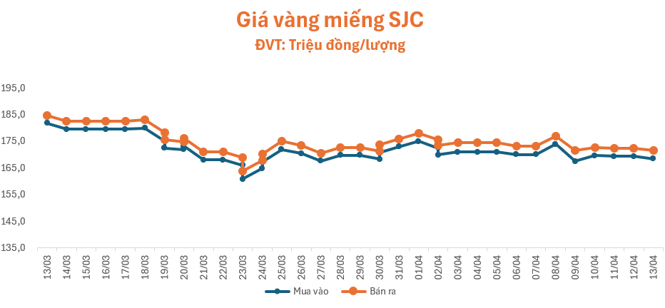 Giá vàng tiếp đà giảm trong phiên giao dịch đầu tuần (13/4), lúc 9 giờ, giá vàng miếng SJC tại cửa hàng SJC, Bảo Tín Minh Châu, Phú Quý, PNJ và Doji đồng loạt niêm yết ở mức 168,5 – 171,5 triệu đồng/lượng (mua – bán), giảm 0,9 triệu đồng/lượng ở cả chiều mua và chiều bán so với giá cuối tuần qua, chênh lệch mua – bán ở mức 3 triệu đồng/lượng.