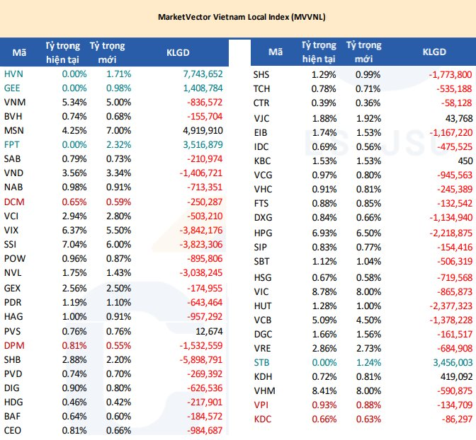Với rổ MarketVector Vietnam Local Index (quỹ VanEck Vectors Vietnam ETF tham chiếu), kỳ này tổ sẽ thêm mới 4 cổ phiếu FPT, HVN, STB, GEE và không loại bỏ cổ phiếu nào. Hiện VanEck Vectors Vietnam ETF có quy mô gần 600 triệu USD, tương đương 15.800 tỷ đồng.