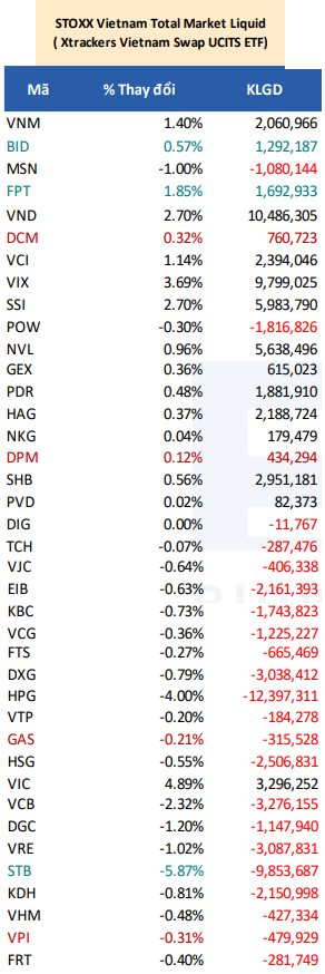 Với STOXX Vietnam Total Market Liquid (quỹ Xtrackers Vietnam Swap UCITS ETF tham chiếu), mã FPT được thêm mới, thay thế cho cổ phiếu GAS. Hiện Xtrackers Vietnam Swap UCITS ETF có quy mô khoảng 357 triệu USD, tương đương 9.400 tỷ đồng.