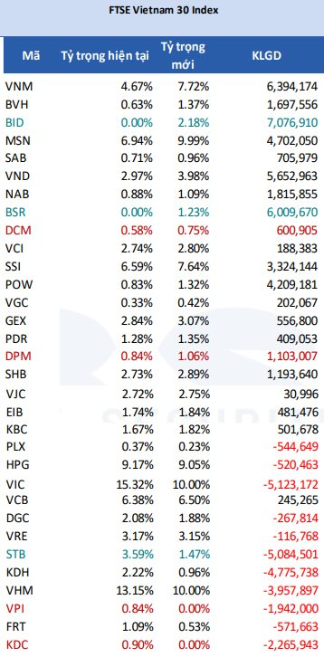 Với rổ FTSE Vietnam 30 (quỹ ETF Fubon tham chiếu), BSC Research đưa ra dự báo danh mục chứng khoán trong kỳ đánh giá tháng 09/2025 có thể thêm mới hai cổ phiếu là BID và BSR, nếu trường hợp này xảy ra thứ tự loại lần lượt sẽ là: KDC và VPI.