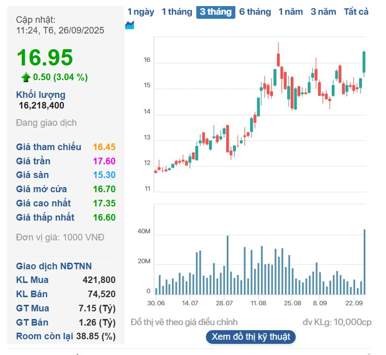 Trong 3 tháng qua, cổ phiếu HHV đã ghi nhận một đợt tăng trưởng ấn tượng, bứt phá từ vùng giá khoảng 12.000 đồng/cổ phiếu cuối tháng 6/2025, tương ứng mức tăng hơn 41%.