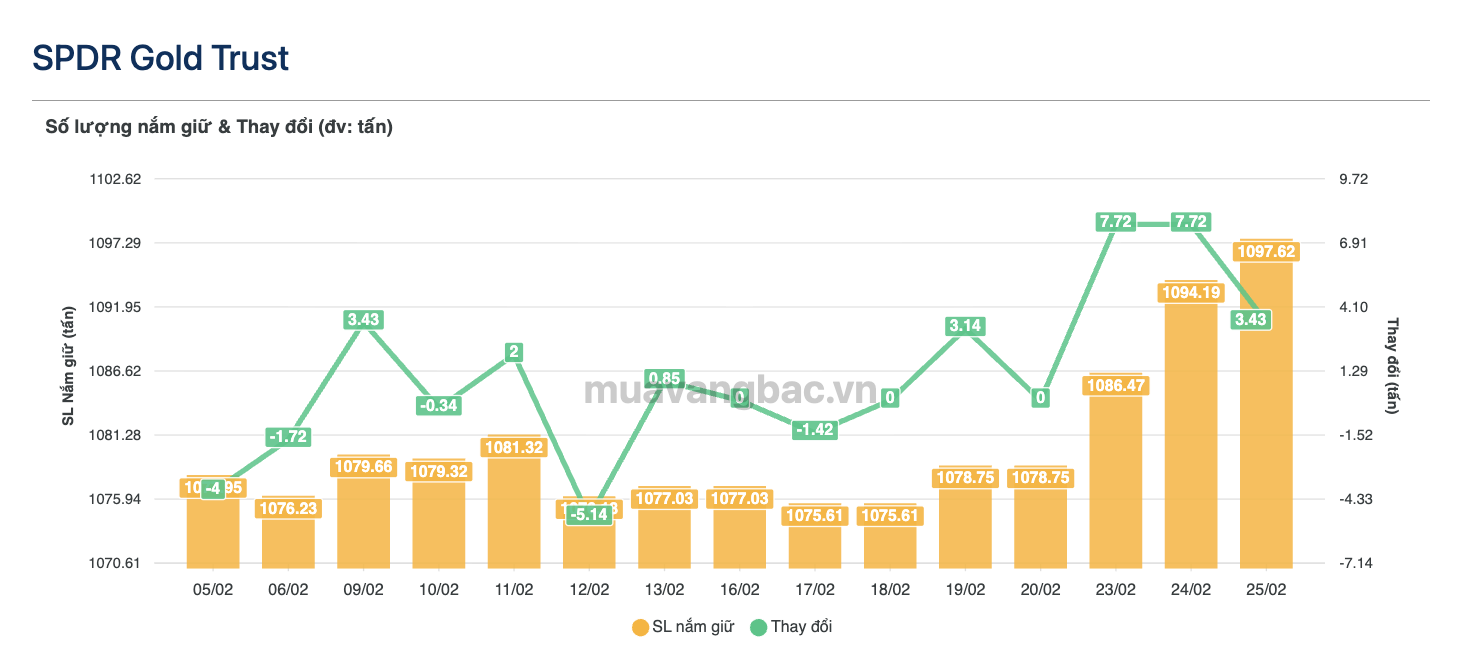 Dữ liệu Muavangbac.vn cho thấy, phiên 25/2, quỹ vàng lớn nhất thế giới SPDR Gold Trust đã mua ròng 3,4 tấn vàng, nâng khối lượng nắm giữ lên 1.097,6 tấn. Như vậy, quỹ đã mua ròng tổng cộng gần 19 tấn vàng trong 3 phiên liên tiếp.