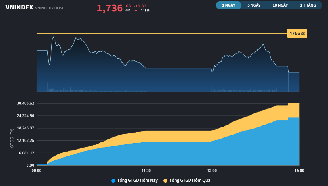 Chỉ số VN-Index đã thể hiện sự bấp bênh sau 2 phiên tăng điểm liên tiếp. Chỉ số quay đầu xuống 1.736,68 điểm, giảm 19,87 điểm (-1,13%). Tổng giá trị giao dịch sàn đạt 25.200 tỷ đồng.