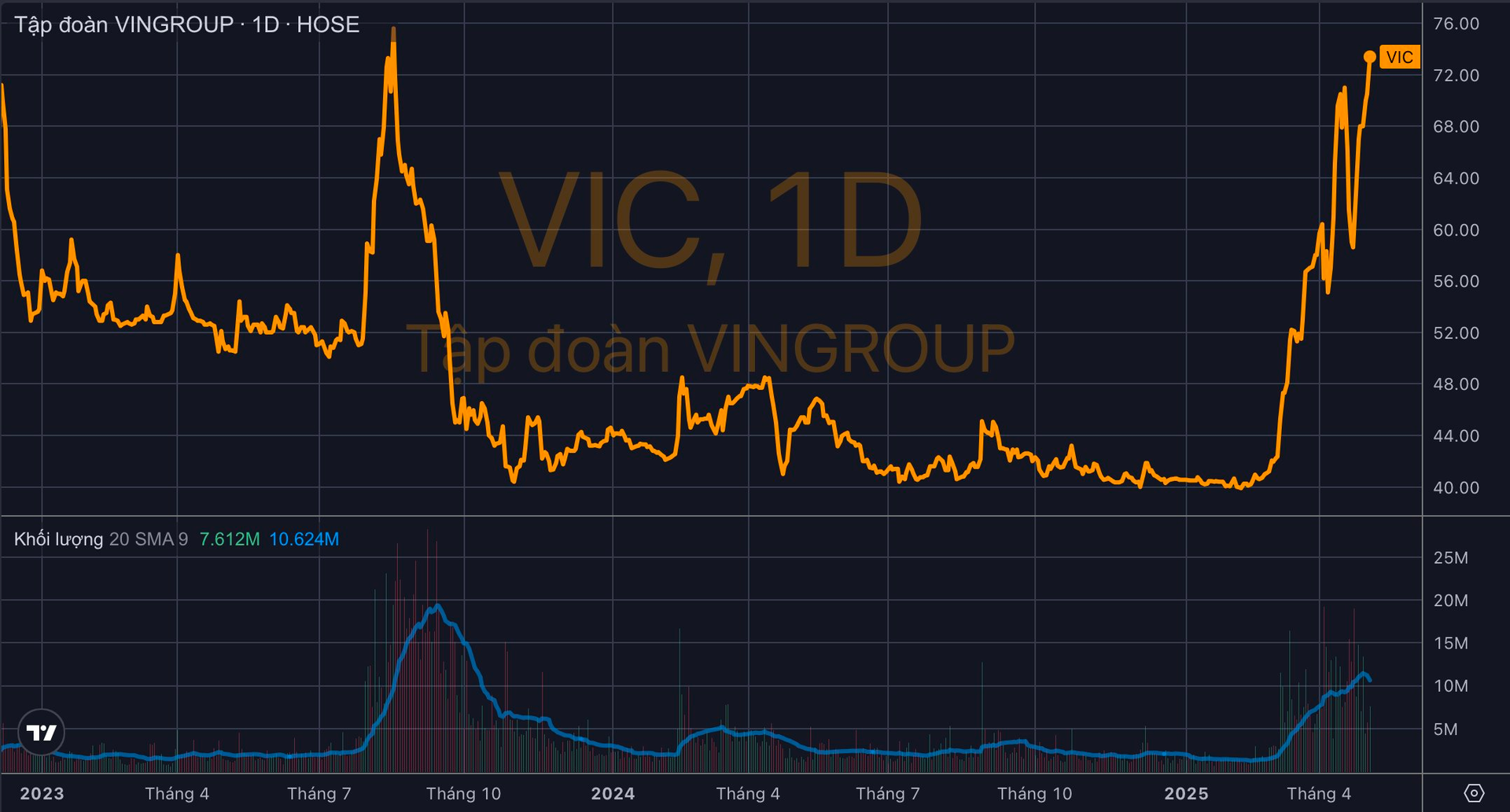 Thực tế, cổ phiếu VIC nổi sóng từ đầu tháng 3, khi Vinpearl nộp hồ sơ niêm yết lên HoSE. Trong 2 tháng trở lại đây, cổ phiếu này đã tăng hơn 70%. Tính từ đầu 2025, VIC là cổ phiếu tăng mạnh nhất VN30. Ngoài câu chuyện Vinpearl, Vingroup còn dồn dập đón tin vui từ hoạt động sản xuất kinh doanh của VinFast cùng loạt dự án khủng trong lĩnh vực bất động sản, hạ tầng, năng lượng,…