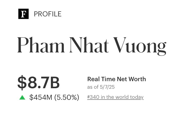Cổ phiếu VIC “bốc đầu” đẩy giá trị tài sản của tỷ phú Phạm Nhật Vượng tăng vọt. Ước tính, giá trị tài sản của ông Phạm Nhật Vượng trên sàn chứng khoán Việt Nam vào khoảng 150.000 tỷ đồng (5,9 tỷ USD). Còn theo cập nhật mới nhất từ Forbes, ông Phạm Nhật Vượng là người giàu nhất Việt Nam với khối tài sản tại ngày 7/5 lên đến 8,7 tỷ USD. Con số này đưa Chủ tịch Vingroup leo lên vị trí thứ 340 trong danh sách những người giàu nhất thế giới.