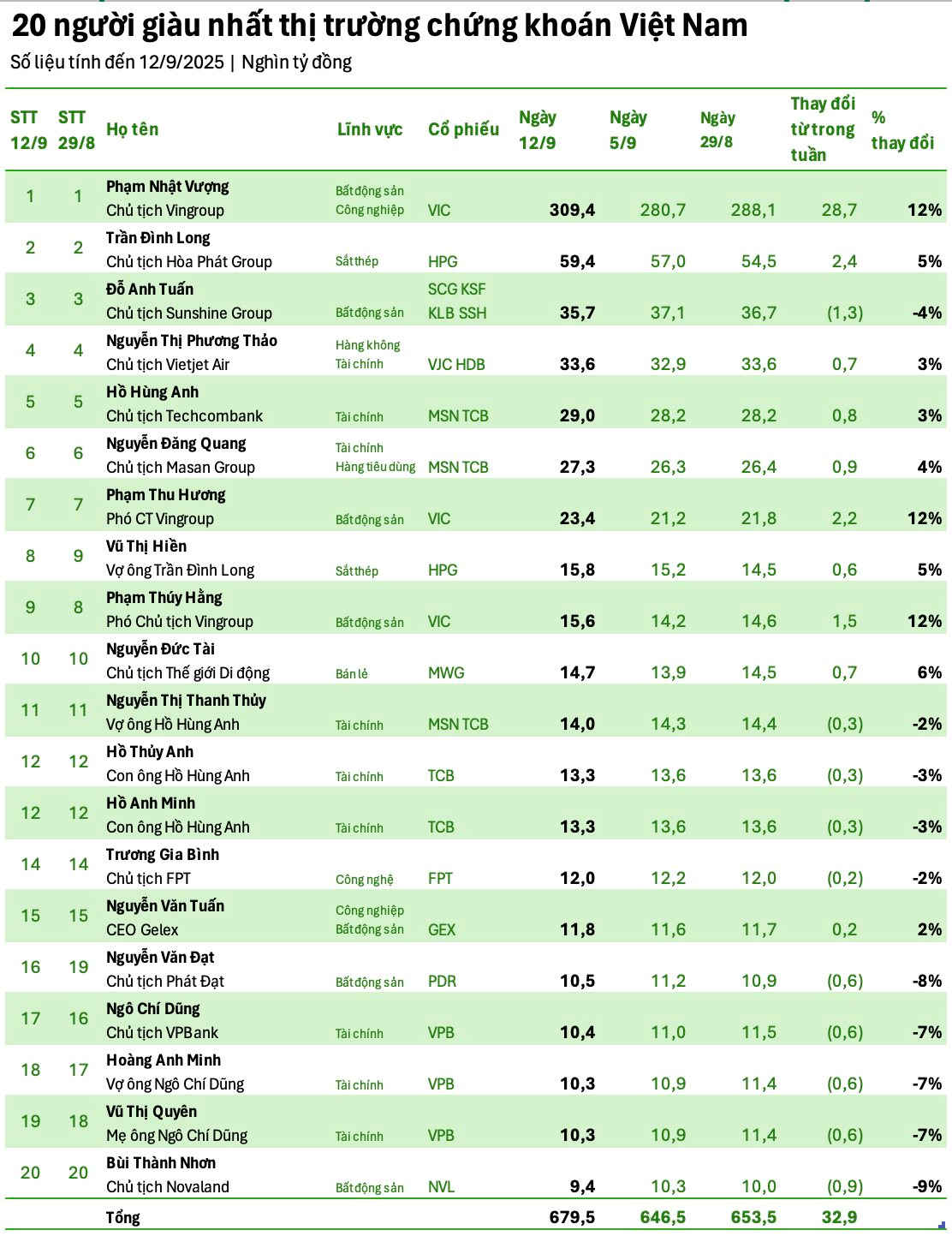 Tính đến ngày 12/9/2025, tổng tài sản 20 người giàu nhất đạt 679.500 tỷ đồng, tăng thêm gần 33.000 tỷ đồng so với tuần trước đó.
