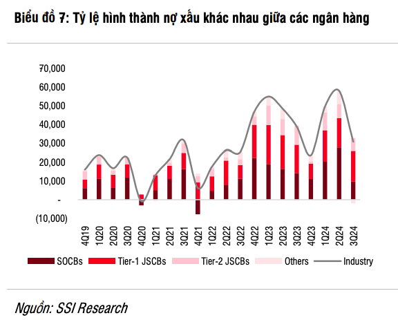 Sau khi tăng vọt lên 2,12% vào quý II/2024, tỷ lệ hình thành nợ xấu đã giảm đáng kể ở các ngân hàng SSI Research nghiên cứu xuống còn 1,22% trong quý III/2024, ngoại trừ OCB, MBB, TPBank và VIB.
