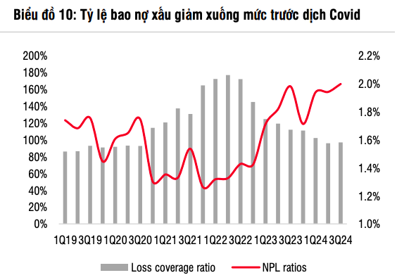 SSI Rerearch cho rằng khả năng thanh toán nợ vẫn còn yếu, điều này ảnh hưởng đến việc thu hồi nợ của các ngân hàng. Tuy nhiên, chuyên gia cũng kỳ vọng ngân hàng sẽ đẩy mạnh xử lý nợ xấu trong quý IV/2024 và giúp tỷ lệ nợ xấu giảm xuống 1,9% vào cuối năm 2024. Điều đáng chú ý là chi phí tín dụng nhỏ hơn nhiều so với tỷ lệ hình thành nợ xấu kể từ quý III/2022, điều này thường sẽ ám chỉ dự phòng sẽ tăng trong thời gan tới. Tuy nhiên, với sự hỗ trợ của NHNN và Chính phủ, các ngân hàng giờ đây có thêm thời gian để giãn việc trích lập dự phòng và ghi nhận nợ xấu. Vì thế, chi phí tín dụng được dự báo sẽ sẽ giảm 9 điểm cơ bản so với cùng kỳ xuống còn 1,28% trong năm 2024.