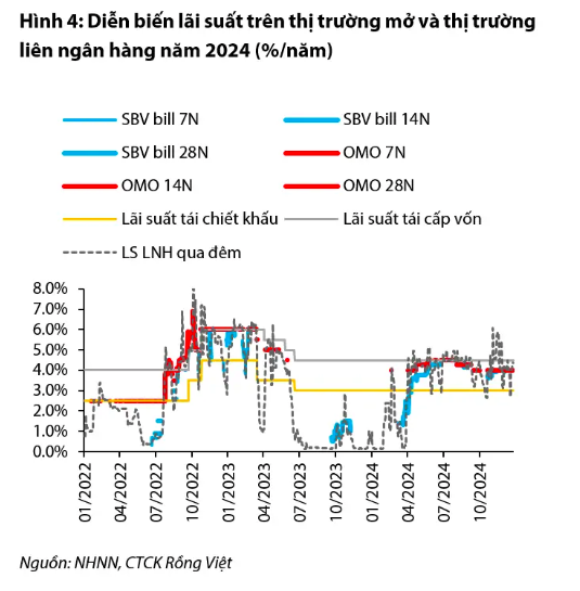 Ngoài việc bán ngoại tệ để kiểm soát đà mất giá của tiền đồng, NHNN cũng tiến hành can thiệp trên thị trường mở thông qua việc kiểm soát hành lang lãi suất. Hoạt động hút ròng thường gia tăng trong những giai đoạn tỷ giá tăng cao như giai đoạn tháng 5-6/2024 hay tháng 10 và tháng 12/2024. Tính chung cả năm 2024, quy mô điều tiết thanh khoản trên thị trường mở của NHNN tương đối nhỏ, hút ròng khoảng 28 nghìn tỷ đồng, so với quy mô bơm ròng khoảng 66 nghìn tỷ đồng trong năm 2023.