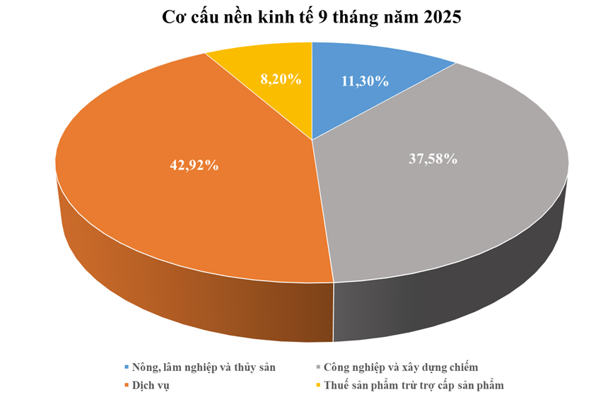 Nhìn từ phía cung, các ngành kinh tế ghi nhận những diễn biến khá tích cực trong 9 tháng, với khu vực công nghiệp và xây dựng đạt mức tăng 8,69% so với cùng kỳ, đóng góp 43,05% vào mức tăng tổng giá trị tăng thêm của toàn nền kinh tế; khu vực dịch vụ tăng 8,49%, đóng góp 51,59%; khu vực nông, lâm nghiệp và thủy sản tăng 3,83%, đóng góp 5,36%.