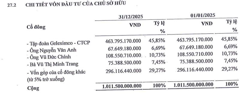 Tại thời điểm 31/12/2025, Chứng khoán An Bình ghi nhận 4 cổ đông lớn gồm Tập đoàn Geleximco sở hữu 45,85% vốn điều lệ; ông Nguyễn Văn Anh sở hữu 6,69% vốn điều lệ; ông Vũ Đức Chính sở hữu 10,73% vốn điều lệ; bà Vũ Thị Minh Trang sở hữu 7,45% vốn điều lệ; và các cổ đông nhỏ sở hữu 29,27% vốn điều lệ. Sau động thái bán ra của Tập đoàn Geleximco, Chứng khoán An Bình chỉ còn 3 cổ đông lớn.