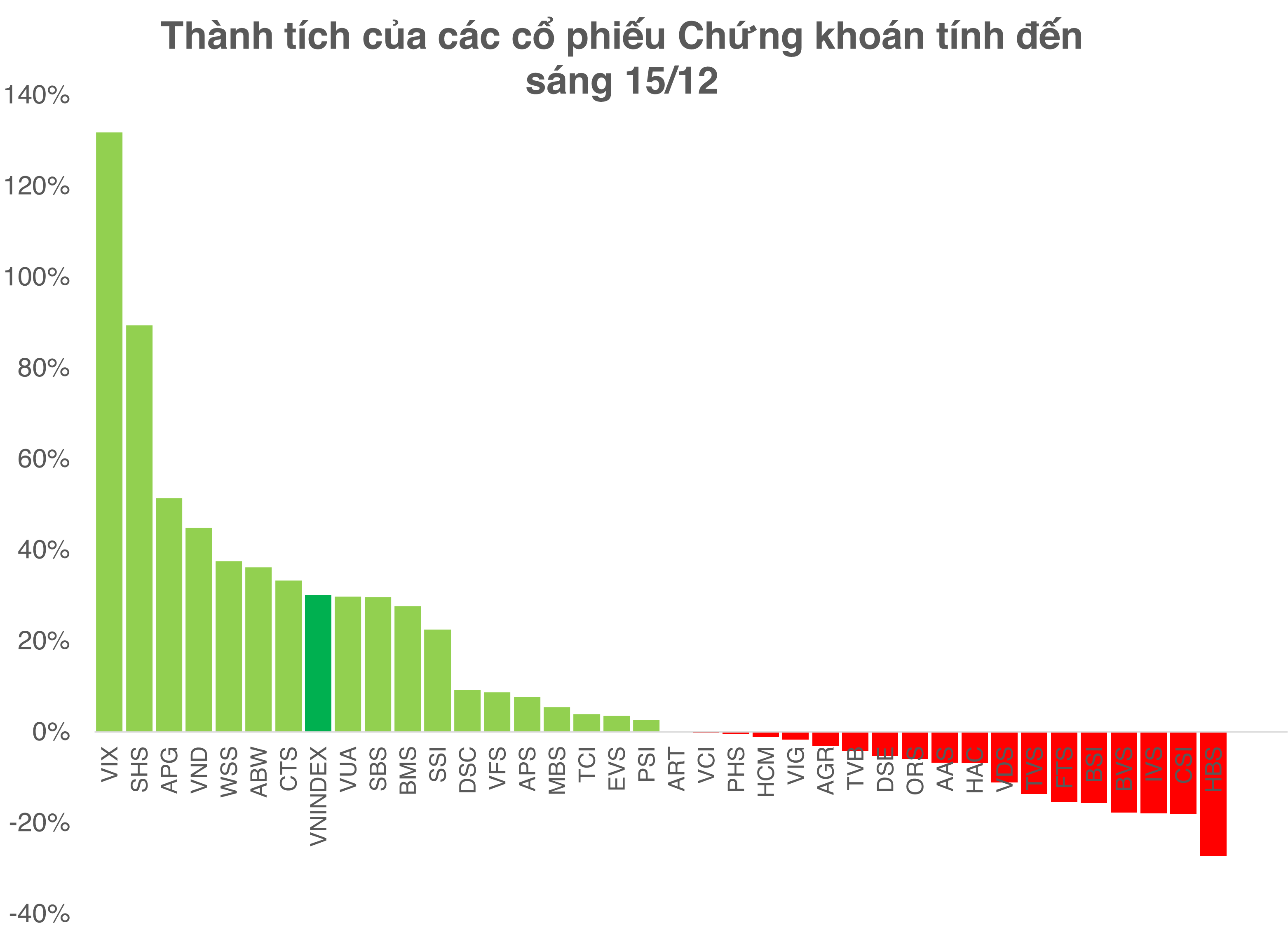 Nhiều mã lớn từng là tâm điểm của sóng nâng hạng như VIX, MBS, VND hay FTS đã chiết khấu từ 30–50% so với vùng đỉnh, dù kết quả kinh doanh năm 2025 ghi nhận mức tăng trưởng kỷ lục.