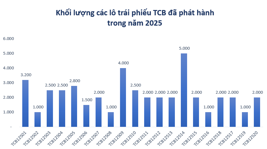 Trước đó, ngày 30/9/2025, Techcombank cũng đã phát hành liên tiếp 2 lô trái phiếu có mã TCB12517 và mã TCB12518, mỗi lô trị giá 2.000 tỷ đồng và cùng kỳ hạn 24 tháng, tổng trị giá thu về đạt 4.000 tỷ đồng.